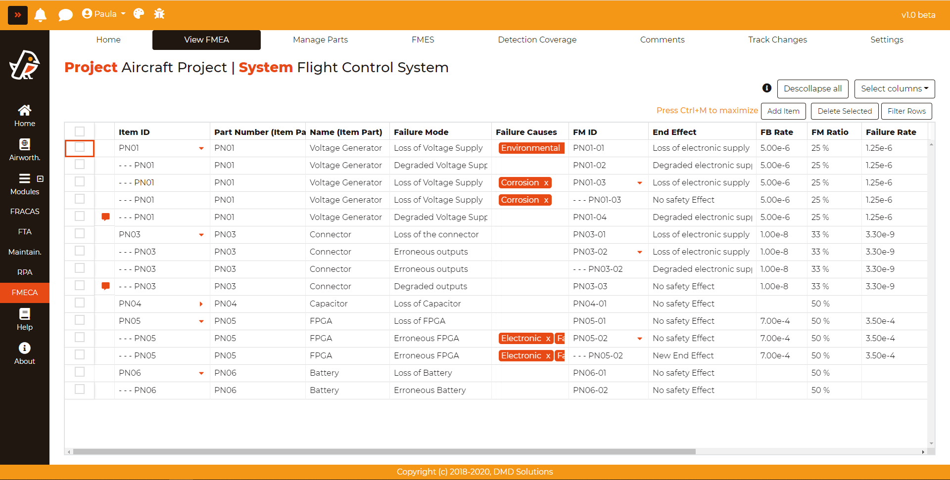 The user can work on the FMECA project in FMECA > View Table, the system can be selected in the FMECA module home page.