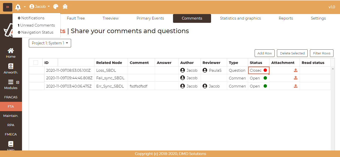 The Comments page allows to the different users to make comments on each node of the FTs.