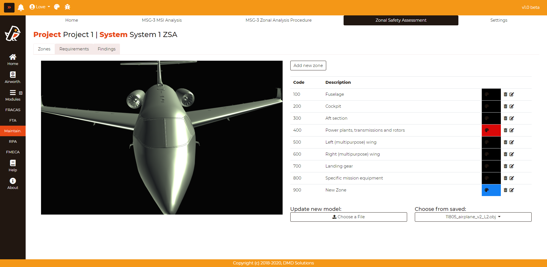 To enter a zone, go to Maintainability > Zonal Safety Assessment > Zones and click on the Add new zone button. A popover will appear: