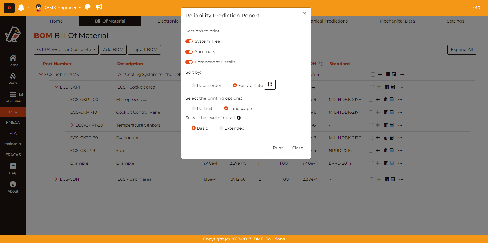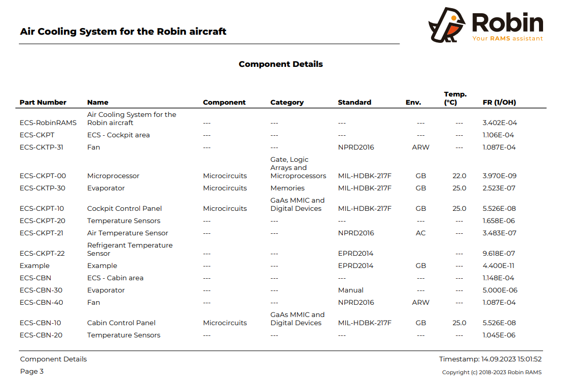 In this form, the user can select the sections to be printed. Also, the items can be sorted by failure rate (lower to higher or viceversa) or the order that they appear in Robin website interface. The last option allows the user to choose the level of details in the Component details section (explained below).