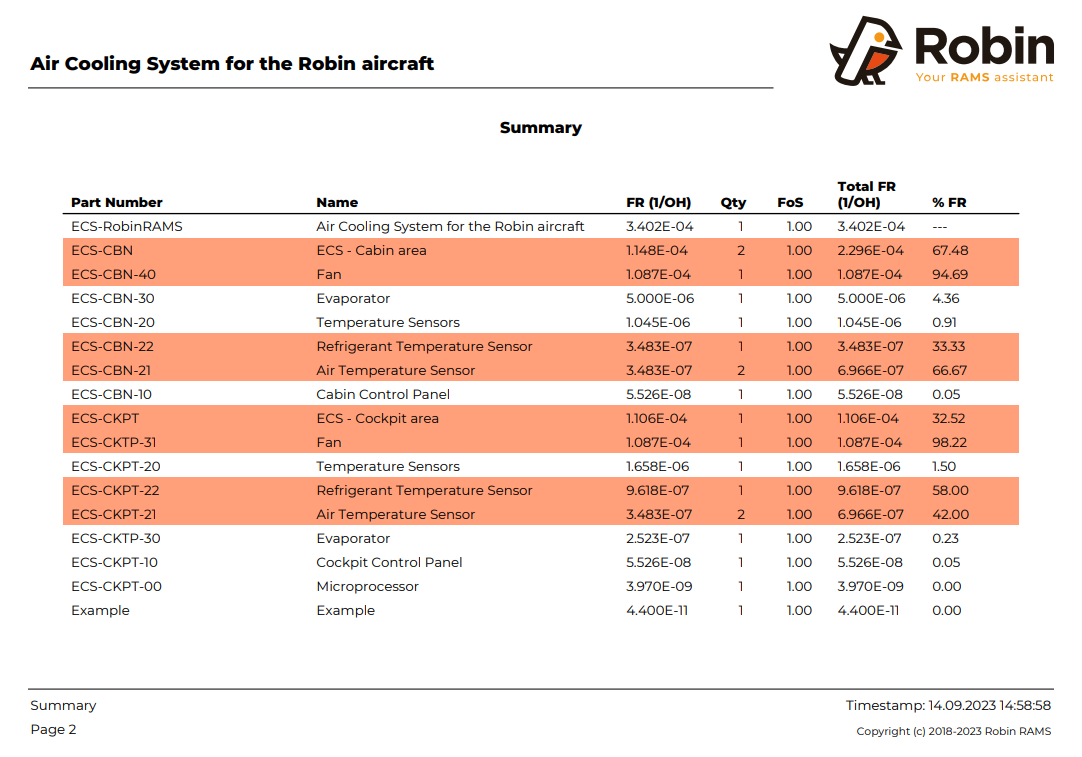Summary: A summary (without levels) of the failure rate and quantity of each component is presented (including percentages of the individual contributions to the quantity and failure rate). The items that contribute more to the failure rate are highlighted in red.